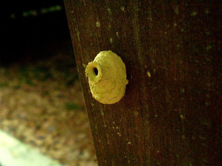 くるま椅子劇場の外壁に、徳利(とっくり)型をした1cmほどの巣を見つけました。小さな黄色い筋のある蜂が、さかんに小さな緑色の幼虫を運んで押し込めているようでした。