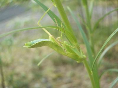暑かったです。今日も30度を越えました。カマキリも狩りどころではないようで、ユリの花の日陰で休んでました。日が落ちて、ようやく仕事に入るようです。葉っぱに見えますか。 こんな日は文庫で一日読書でもどうですか。図書室のみのご利用は自由です。(U)