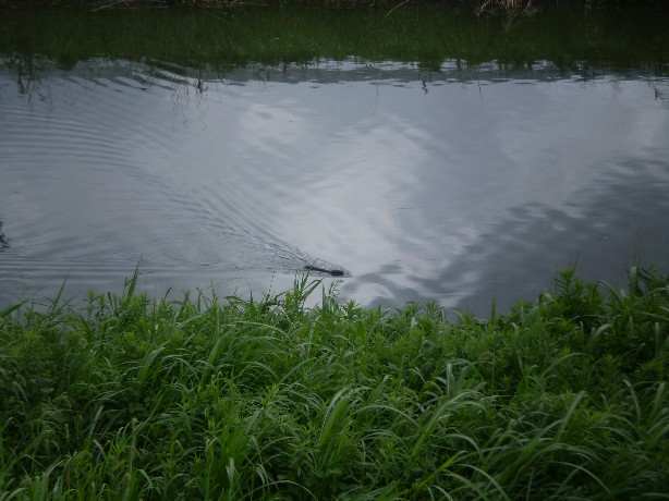 佐分利川を泳いで渡るヌートリアらしき動物、大変居心地よさそうに見えました。(T)