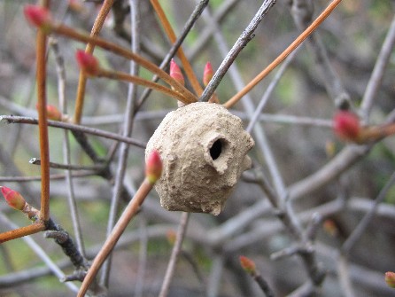 庭の美しかった紅葉も終わり、枝ばかりとなりました。六角堂(お休み処)脇に生えるドウダンツツジの枝に、小さな土で出来たトックリバチの巣を幾つか見つけました。巣の形が徳利(とっくり)型をしていました。季節が夏だと葉が生い茂り、とても見つける事が出来ませんが、枝ばかりになるこの時期は丸見えになり、よけい目立ちます。