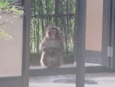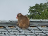隣の山から猿が何匹もやって来て、文庫の瓦屋根の上でドタバタしました。本館の室内にいると、猿の足音から屋根のどのあたりを移動しているのかが手に取るように分かります。文庫の屋根に登り、我が物顔でドタドタキィーキィー暴れる猿の姿を見て、広い瓦屋根のグラウンドで猿たちは、心地よく体育の授業をうけているような気持なのだろうかと想像しました。お客様が出入りする長屋門の玄関先で、たまたま私と猿の目が合い、猿がお邪魔しますと手を合せていたので写してみました。一時、文庫は猿の貸し切り状態となっていました。(T)
