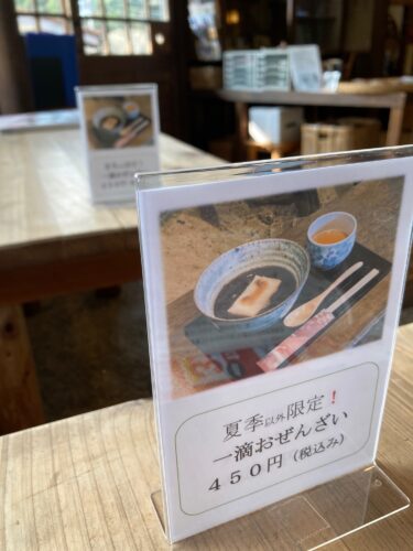 あれは先日のことです。私が六角堂でちょっとした打ち合わせをしていたら、ご夫婦での来館者様が六角堂で休憩っと入って来られました。すぐ横にお座りになられましたので、話し声が聞こえてきたのですが…「あれ、ぜんざいがあるよ」「あっ、本当だ! でも、夏季限定になってるよ」「あっ残念。でも、夏にまた来る楽しみができたね‥‥って、これ違う! 夏季以外限定だ(笑)」「えっ、あっ、本当だ。ある意味すごい……」との会話でした(笑)。