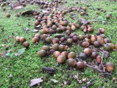 秋の行楽シーズン。連日、大型観光バスが何台も駐車場に並び、大勢のお客様が来館され一滴文庫は大盛況です。最近、朝と夜がとても寒くなり庭の木々が美しく紅葉してきました。朝方、庭の落葉を掃き取っていると、沢山のドングリが落葉と一緒に混ざって落ちているのを見つけ、写して来ました。毎年ドングリを見つけますが、今年は特に多いです。