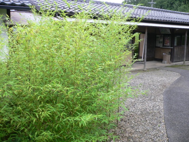 黒竹が今年も生え揃いました。今は緑ですがもうすぐ黒に変わります。趣があり見ていて飽きない黒竹です。枝にトンボが止まりました」。竹と区別がつかないほどに景色に溶け込んでいます。(M)