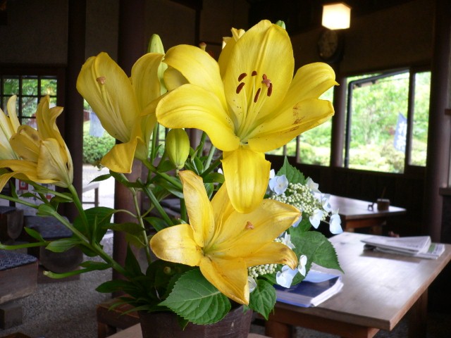 梅雨の真ん中ですが七月になりました。六角堂には鮮やかな黄色のユリが飾られました。竹藪にはキノコが出ています。庭の植物もグングンと伸びます。この時期はあらゆるものの息吹を感じます。