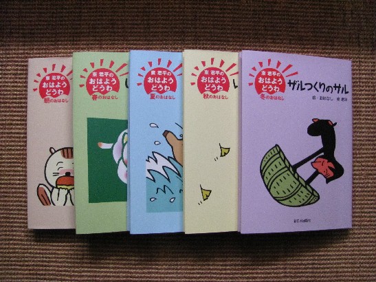 最初の「東君平のおはようどうわ(全5巻)」は、動物を主人公に、なんとなくほっとするお話しと、やさしいタッチの切り絵で構成されていて、毎日読んでもあきない本です。