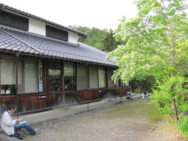 先日、「渡辺淳展」鑑賞と、庭のナンジャモンジャのスケッチをするために福井市からお越しになったご夫婦がありました。本館前のお気に入りのアングルを探して陣取り、使い慣れた水彩道具を使用して描かれていました。それを見ていた本展覧会の画家渡辺淳先生もナンジャモンジャを描かれていました。独自であみだされたお気に入りのスケッチ用具「修正液」の効果をご夫婦に教授され、楽しい会話で盛り上がっていました。