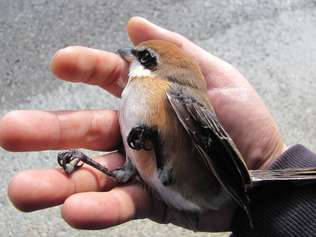 先日は劇場玄関で失神していた雀を助けましたが、今日は本館のガラスに当たり失神していたモズを助けました。小雨降る昼頃に、突然ドーンという音がして飛び出してみると、モズが地面でピクピクしていました。虚ろな目をしたモズに水を与えると息を吹き返し一命をとりとめました。屋外の床机の上で、しばらく日光浴した後飛び去っていきました。雀やヒヨドリは、よく見かけますが、モズが失神しているのは始めて見ました。