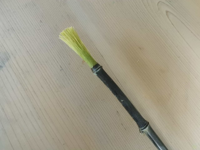 竹筆づくりにはぜいたくにも黒竹を使いますが、育ち始めた若竹ですので、名前は黒竹ですが、色は普通の竹の色、作ったあとは緑の色もなくなります。ということで、正真正銘の黒竹で筆を作ってみました。切るのがもったいないので長さ1mです。さすがに筆先は少々硬いですが、見事な出来だと自画自賛。長い筆先が好みの方は竹の節一つ、もっと長くはもう二つ三つたたいてみてください。筆先も筆の長さも決まりはありません。楽しく作ってみませんか。(u)