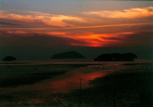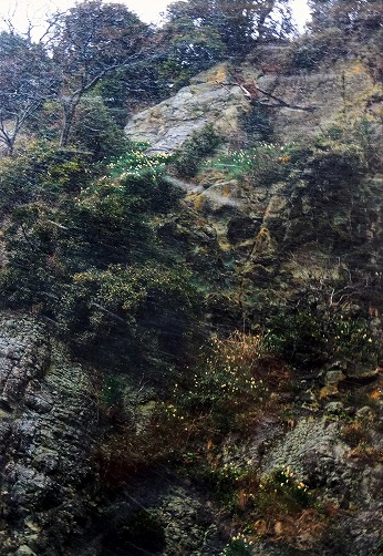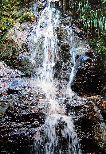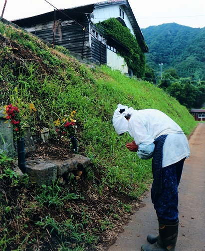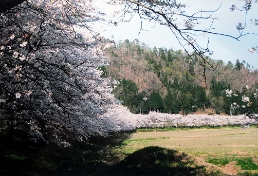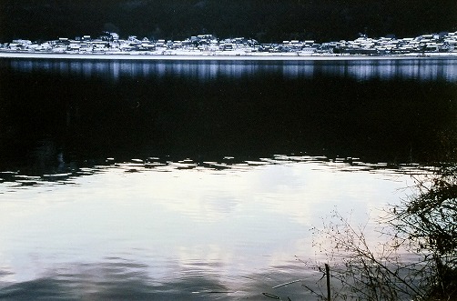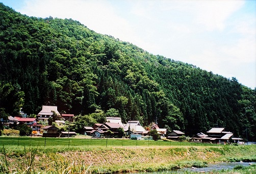 「湖笛」の湖北悲愁、水坂峠の場面である。峠は若狭から近江へ行く一番の難所である。馬上の武士、武田孫八郎元明は、秀吉によって海津の宝憧院で自害に追い込まれようとは知る由もなかった。水坂峠近くの静かな山里、角川集落の棚田は稔りの季節である。